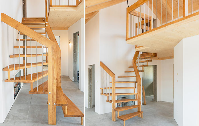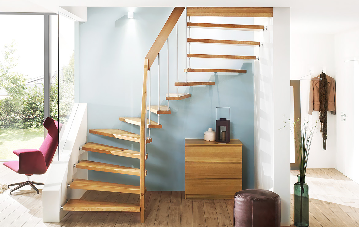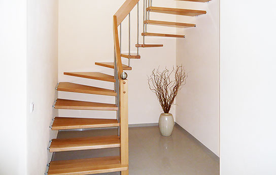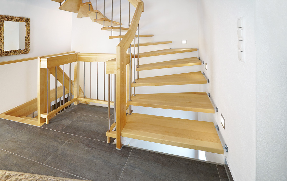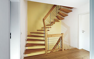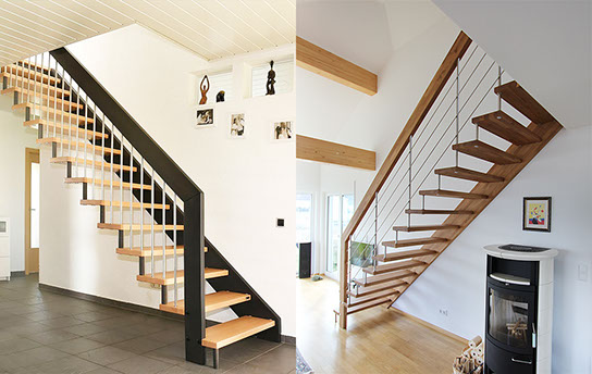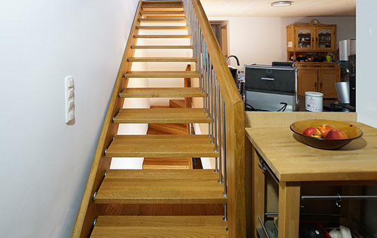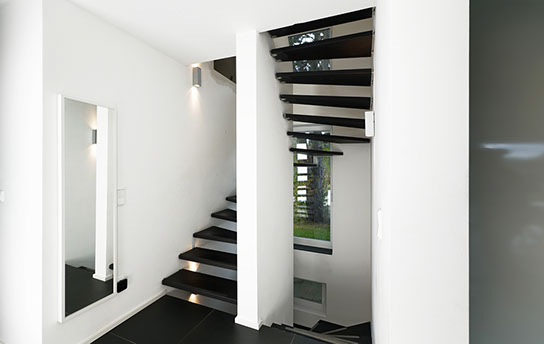 Das Geländer ist Teil der tragenden Konstruktion. Mit der Beschränkung auf das Wesentliche, nämlich Stufen und Geländer, wurde der Treppenbau revolutioniert. Quasi unsichtbar halten die in schalldämmenden Kautschuklagern gehaltenen Stahlbolzen auf der Wandseite die Treppe und das Geländer (Handlauf und Sprossen) die einzelnen Treppenstufen auf der offenen Seite. Eine optimale Verbindung aus Technik und Design, mit vielen Vorteilen.